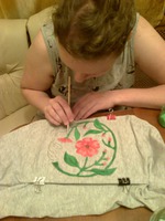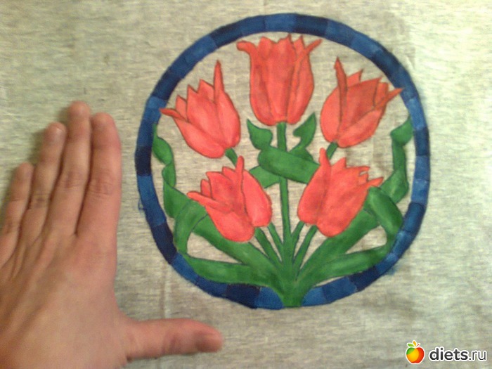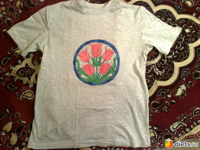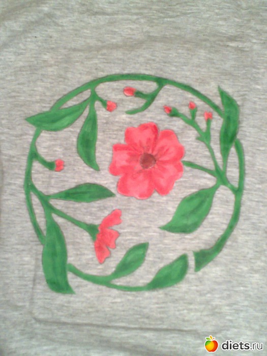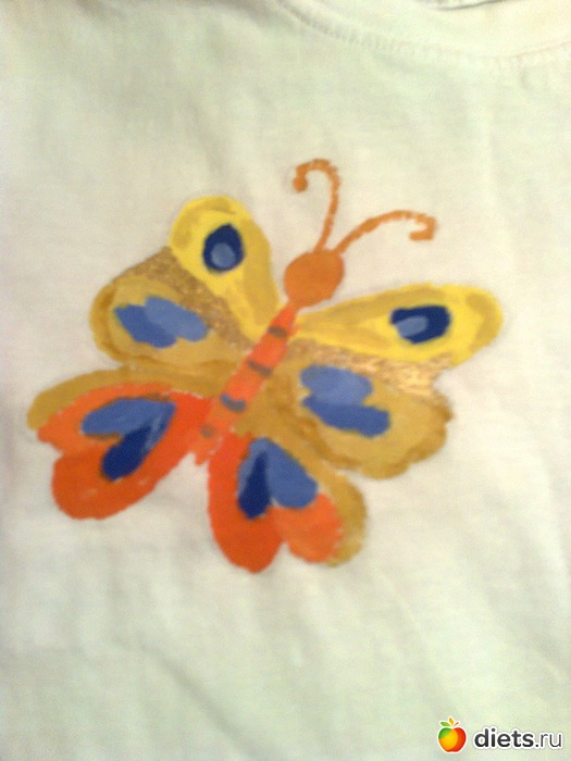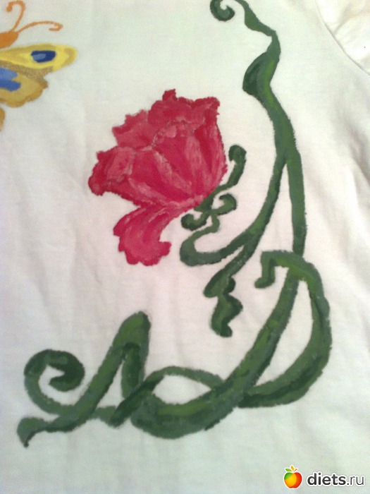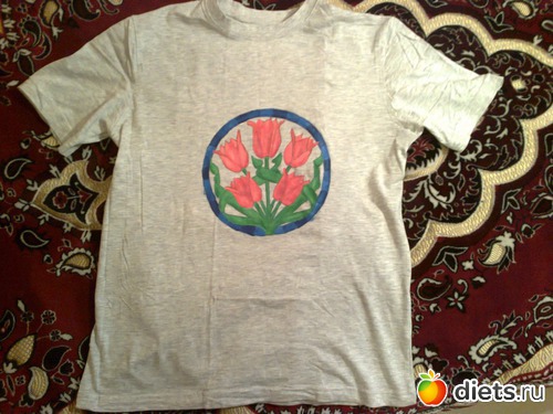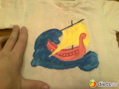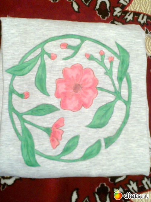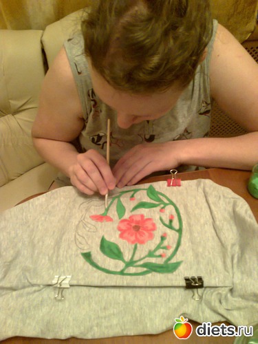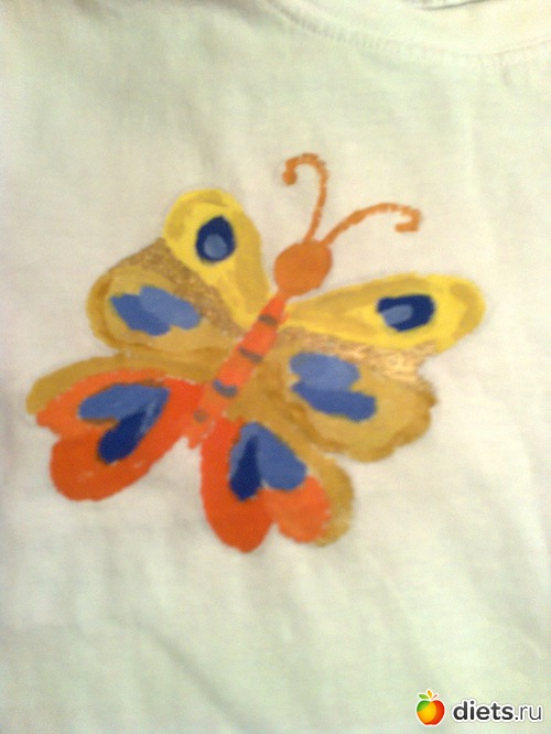 Причем у этих красок есть секрет: все нарисовал, утюгом прогладил минут 10, вывернул на изнанку и постирал, а если тебе что-то вздумалось еще дорисовать, берешь краски, дорисовываешь и опять такие же манипуляции с утюгом… так что можно хоть каждый день переделывать…