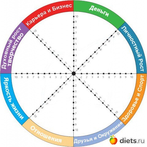 Нарисуйте круг, разбейте его на сектора по количеству сфер или областей жизни, которые играют в ней важную роль. Каждую ось разделите на 10 равных отрезков. У вас должно получиться что-то подобное: