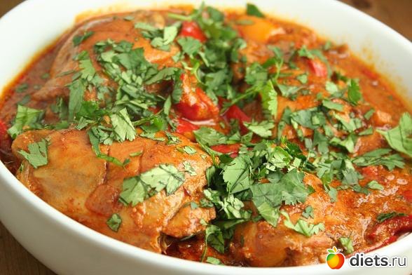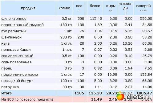 Лук нарезать кубиками, перец - тонкими полосками, грибы - ломтиками. В сотейнике разогреть растительное масло, обжарить лук до легкого изменения цвета, добавить перец, обжаривать вместе 3 мин. Затем добавить грибы и жарить помешивая пока не выпарится вся жидкость. Отставить сотейник в сторону. Куриное филе или грудку нарезать кубиками со стороной 1,5 см. В тарелке смешать муку и карри, обвалять кусочки курицы в этой смеси. В сковороде разогреть масло и обжарить курицу до легкой корочки. Переложить кусочки курицы в сотейник к овощам и грибам. Влить апельсиновый сок и тушить 10 мин. Добавить йогурт, посолить и поперчить. Тушить еще 5 мин. Добавить зелень и можно кушать!