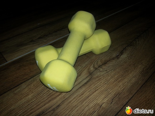 На глаза попались мои желтенькие гантельки, которые мне подарил мой муж, когда мужем ещё не был. Зашли в спортивный как то раз, я решила глянуть какие у них гантельки есть, а он взял и купил мне их. Я такая счастливая тогда была Он был удивлен, что девушку так могут обрадовать гантельки)))