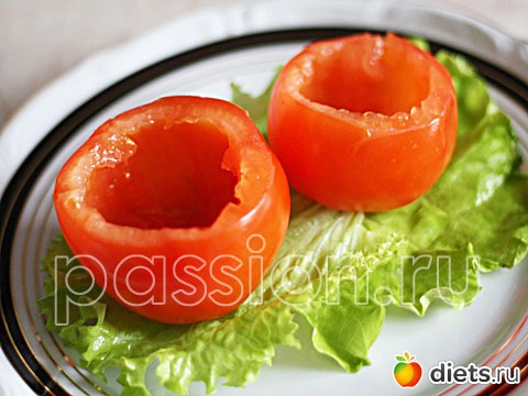 У помидоров срезать верхнюю часть, вынуть мякоть и поместить их на листья салата.