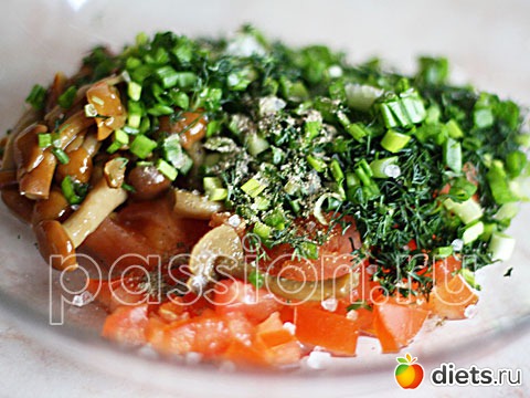 Зелень измельчить, оставить пару веточек укропа для украшения. Мякоть помидора нарезать мелко, образовавшийся сок слить (он нам не понадобится).