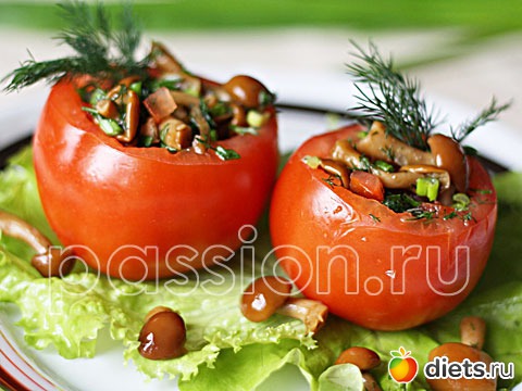 У помидоров срезать верхнюю часть, вынуть мякоть и поместить их на листья салата... Читать полностью