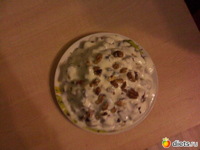 Выложите первый слой из кубиков бисквита, обмазанных в креме (от центра к краям). Затем - слой из ананаса и орехов.
