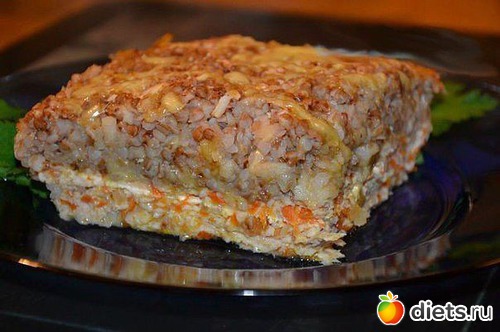 3. Отварила гречку, охладила, добавила очищенные и потёртые на крупной тёрке яблоки и тёртый на крупной тёрке полутвердый сыр, промешала хорошо и выложила вторым слоем в форму, слегка приминая.