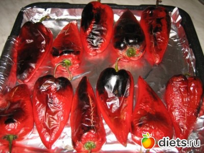 Перцы запечь в духовке. Запекать нужно минут 15-20, важно его не "перепечь", а то он в дальнейшем будет расползаться. Как только шкурка потемнела и вздулась - перцы готовы.