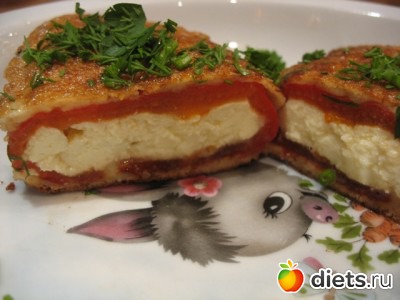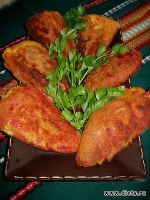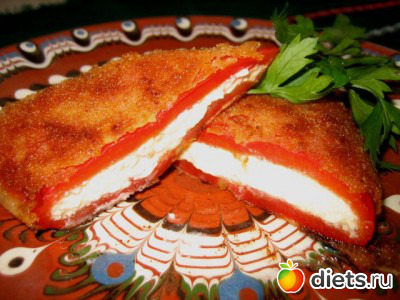 Яйца для начинки слегка взбить, добавить размятую брынзу все перемешать, должна получится густая масса. Можно добавить еще мелко нарезанной петрушки. Аккуратно фаршируем начинкой перцы, придаем плоскую форму, обваливаем в муке, затем во взбитых яйцах, потом в сухарях и опять в яйцах и выкладываем на сковородку с подогретым маслом обжариваться.