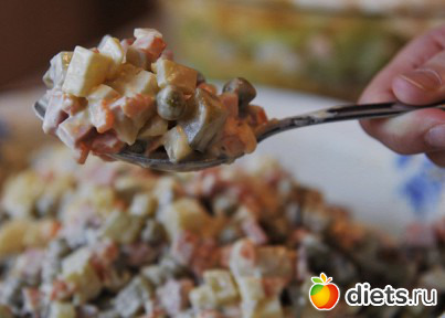 В список ингредиентов для этого салата Росстат включил 300 г вареной колбасы, 380 г зеленого горошка, 700 г консервированных огурцы, полкило картофеля, 4 штуки куриных яиц, 150 г майонеза.