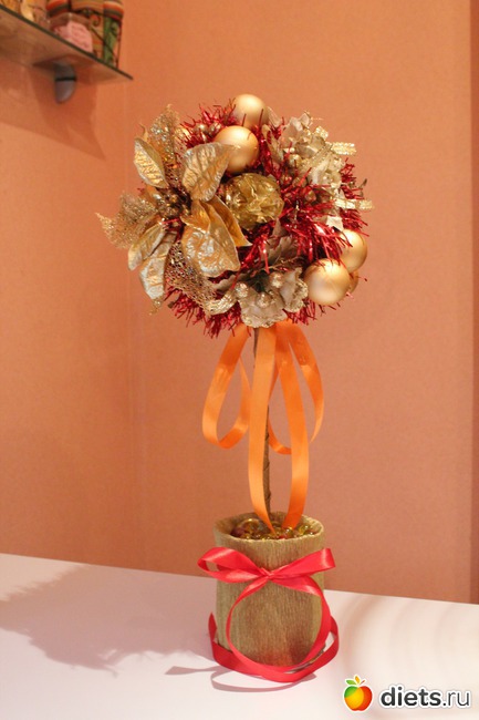 А на счет топиария, делаете плотный шар из газет, заматываете нитками - это основа, в горшочек насыпаете керамзит, заливаете гитсом и замуровываете палку - это основание. Крепите шар на палку, а потом все украшаете по своему вкусу - вот и все!