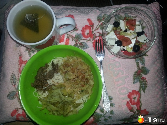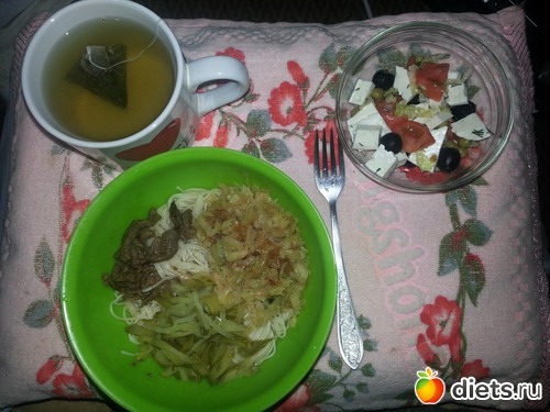 26,12,13 Ужин Кукси, салат из пекинки, брынзы, маслин, помидора, горошка - страшно солёный вышел и чай зел. с мятой и имбирём