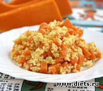 Очищенную тыкву проверните через мясорубку и опустите в кипящее молоко. Добавьте соль, сахар и доведите до кипения, постепенно нагревая. Всыпьте крупу и варите кашу до готовности. Положите в готовую кашу масло и полейте ее медом.