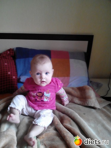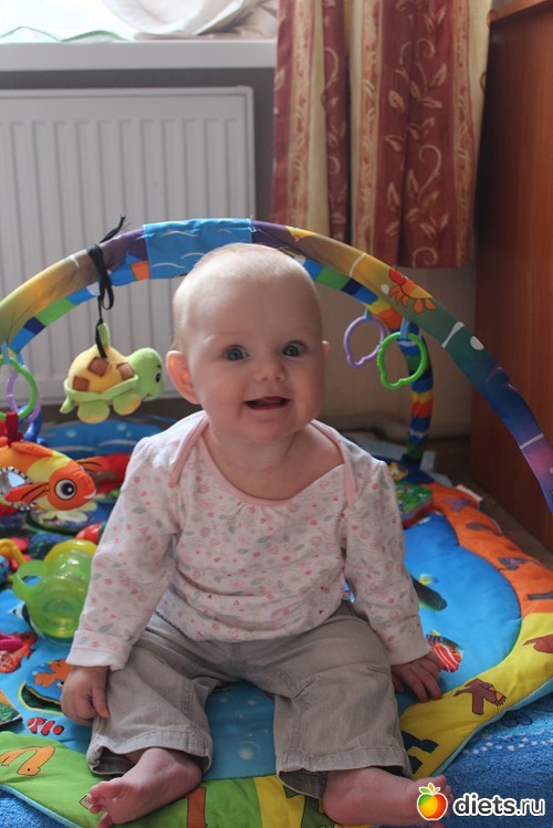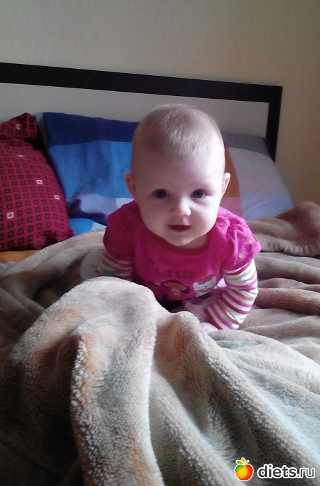Она уже взрослая девочка, все время стремится куда-то ползти в стиле гусеничка, и даже на руках делает ножками такие движения как-будто бежит
