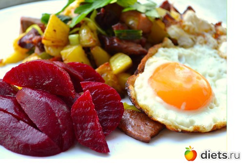 обжарить. Фишка в сервировке с маринованнои свеклои и жаренным яицом.