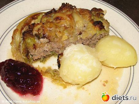 Kålpudding. Пудинг из капусты. Капусту нашинковать, обжарить до мягкости, смешать с мясным фаршем,