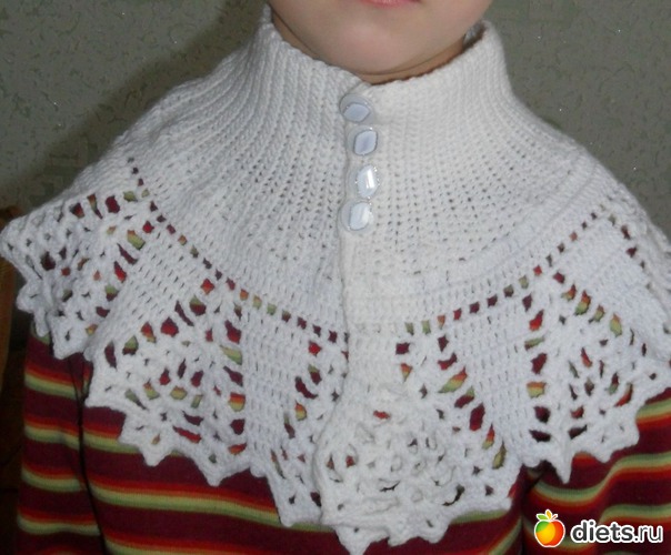 Пряжа "Ольга", крючок № 2,5. Набираем 25 воздушных петель, по цепочке вяжем 1 петлю подъема, 19 столбиков без накида, 3 полустобика, 3 столбика с накидом. Вяжем пока длина полотна не будет равна обхвату шеи. Далее нитку отрываем, привязываем к нижнему уголку и вяжем по схеме до 9 ряда, затем обвязываем манишку столбиками без накида, делаем отверстия для пуговиц, пришиваем 5 пуговиц.