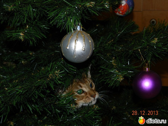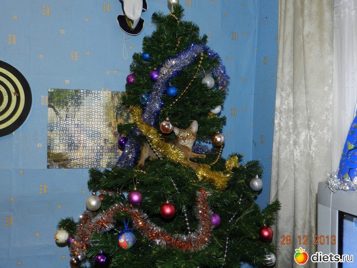 Я побоялась дождь вешать, читала,что кошки умереть от него могут, думаю что в следующий раз и мишуру не буду вешать в доступном для него месте.