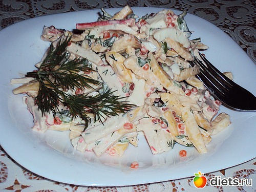 Добавить порезанные соломкой крабовые палочки и белки варёных яиц.