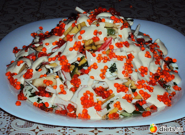 Полить приготовленным соусом и обсыпать красной икрой. Очень вкусно получается с натуральной икоркой, часто делаю на праздники, для будней дороговато, поэтому сделала в данный момент, т. е. к ужину с белковой икрой.