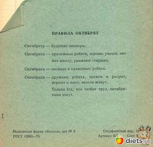 Тетрадки были простенькие, без рисунков и надписей. На обратной стороне печатались правила поведения школьников, таблица умножения или, на худой конец, слова песен: «Взвейтесь кострами, синие ночи», «День победы», «Орленок», «То березка, то рябина», «С чего начинается Родина», «Гимн СССР». Тетрадки почему-то были грязно-грустных цветов: синие, розовые, зеленые, желтые. До сих пор для меня загадка, почему в тетрадках в клеточку не было полей? Их надо было самим чертить, причем обязательно красным карандашом, а не ручкой.