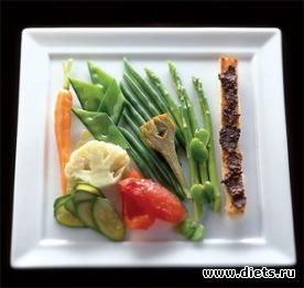 Приготовьте овощи: артишоки очистите и разрежьте на две части. Обжарьте в течение 5 мин в оливковом масле. Помидоры обдайте кипящей водой, очистите и разрежьте на четвертинки. Отбланшируйте зеленую фасоль в течение 5 мин, спаржу — в течение 5 мин, зеленый горошек и кабачки — в течение 3 мин. Опустите в емкость с ледяной водой. Перед подачей на стол разогрейте овощи в микроволновой печи в течение 1 мин.