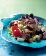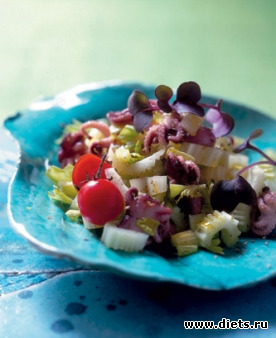 Каракатиц вымойте, очистите и нарежьте кусочками. Обжарьте в течение 5 мин. Влейте уксус и дайте ему выпариться. Переложите каракатиц в салатницу. Выдавите сок из зубчика чеснока над салатницей. Сельдерей вымойте и нарежьте кружочками. Добавьте в салатницу. Посыпьте орегано, посолите и поперчите. Полейте маслом, перемешайте и уберите в прохладное место на 1 час. Добавьте помидоры черри. Подавайте охлажденным.