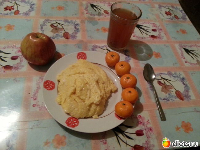 Кукурузная молочная каша,5 мандаринок, стакан компота. Яблоко я не осилила..съела его уже на работе в 11 часов. Кашу делала в мульте, на отложенном старте. Проснулась - каша готова. Красота!