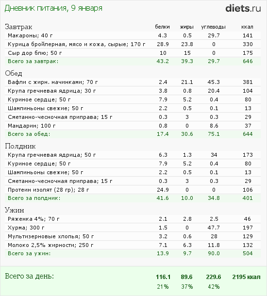 Итак начала исправительное питание. С учетом спорта (пока в основном кардио) я питаюсь в корридоре 2000-2100 ккал, в дни без спорта буду немного снижать 1800-1900 ккал. Вот что у меня получилось за эти 2 дня: