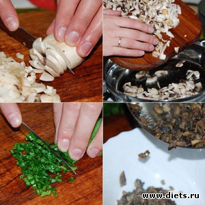 Шампиньоны мелко нарезаем, подсаливаем и обжариваем до готовности. Пока жарятся грибы, мелко рубим петрушку.