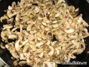 Шампиньоны режем тонкими пластинками, бросаем к луку и жарим до мягкости, солим по вкусу.