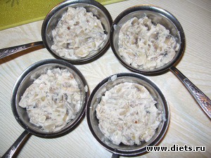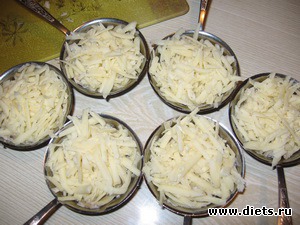 Ставим кокотницы на противень и отправляем в духовку до расплавления и легкого зарумянивания сыра.