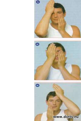 4. а-в. Сильными движениями одно¬временно резко проведите одной рукой вверх, от подбородка ко лбу, а другой -вниз, от лба к подбородку.