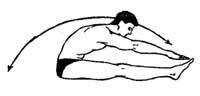 7. Медленно приподнимитесь и коснитесь руками пальцев ног, не сгибая коленей и не отрывая их от пола. Затем так же медленно ложитесь. Повторите 3 — 4 раза.