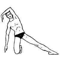 12. Встаньте на колени, правая рука над головой, правая нога отведена в сторону. Как можно глубже наклонитесь влево. Повторите по 5 раз в каждую сторону.