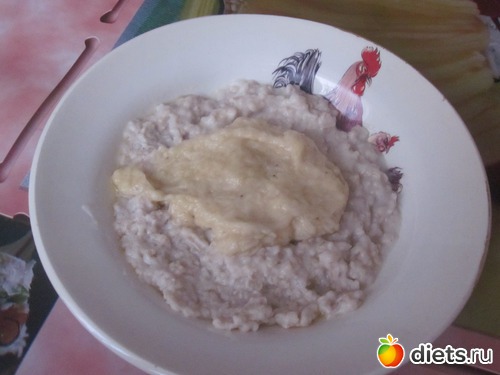 Овсянка на воде, без сахара и соли, в готовую кашу добавила 30мл молока 2,5% и 1/2 банана на мелкой терке.