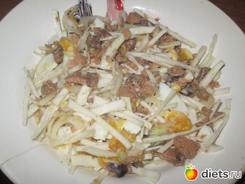 На ужин ела свой любимый салатик, консервированный тунец в собственном соку 70гр., 1 яйцо куриное, немного капусты белокачанной и половинка маленькой луковицы, полила 10мл сока от тунца.