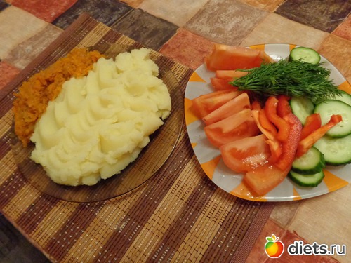 Ужин был самым вкусным). Картофельное пюре, морковка, оставшаяся от завтрака, огурцы, помидоры, перец болгарский, укроп.