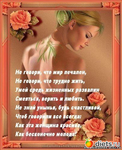 ... Если бы мы также разговаривали с собой, умели бы договариваться с собой, стрессов было бы гораздо меньше. Мы кормили бы себя фруктами, качественными продуктами, ограничивали бы химию, генно-модифицированные продукты, жиры, сладости без меры. Мы жалели бы свою талию, свои зубки, своё здоровье в целом.