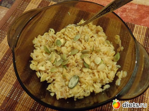 Залила кипятком на 3мин. и добавила тыквенные семечки. Всю порцию не съела. Половину доела на полдник.