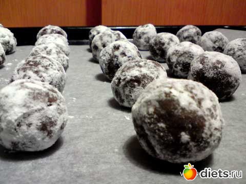 Каждый из них обваливаем в сахарной пудре и выкладываем на противень, накрытый пергаментной бумагой. Только не забудьте оставить между шариками расстояние, поскольку трюфельное печенье при нагревании слегка расплющится.