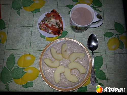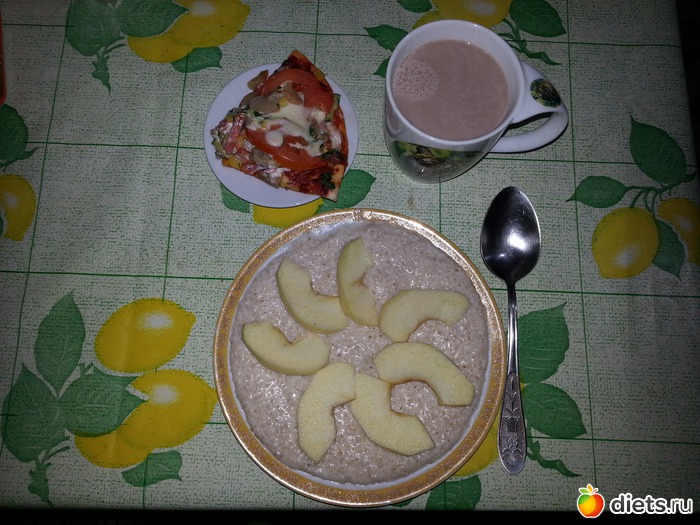 19,01,14 Завтрак Кусок пиццы, половина тарелки ячневой каши на молоке с яблоком, стакан Несквика с молоком 2,5%. Оставшаяся половина съета на полдник.