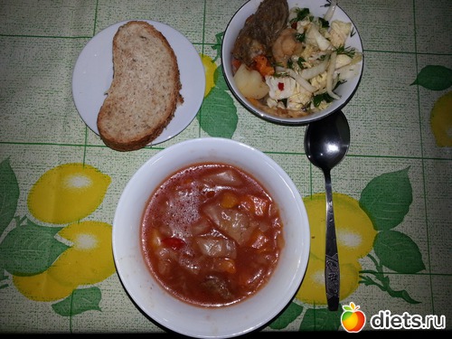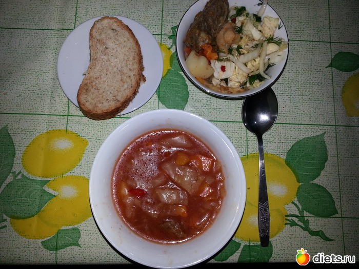 19,01,14 Ужин Пол-порции борща, 1 кусок запечённой говядины, овощи, капустный салат, кусок отрубного хлеба