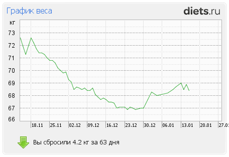 ), я стала еще ближе к своему идеалу. Выравнила питание, сделала его более здоровым и правильным, добавила домашний спорт. К 30.12.2013 мой вес составил 67 кг.
