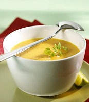 Положить сельдерей, порошок карри и мускатный орех. Варить все на слабом огне в течение 20 минут. Процедить, вынуть сельдерей и протереть овощи и креветки сквозь сито или измельчить блендером.