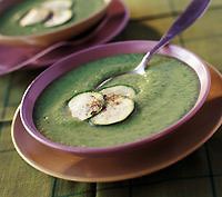 Продукты: шпинат - 250 г, сливочное масло - 15 г, мука - 1 ст. ложка, молоко или сливки - 200 мл, мясной бульон - 200 мл, 1 сырой желток, соль, пряности по вкусу. Для украшения - несколько долек цукини-гриль.