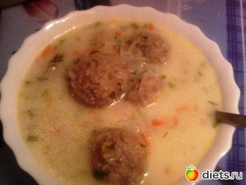 Ужин: Суп с индюшкамафрикаделькама... (фаршик остался от перцев, правда без всего остального, сформировала шарики и в кипяток, добавила лучок и морковочку, потом добавила зелень (укроп, лук). Вкусно получилось....