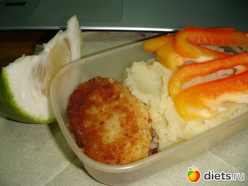 ... Как решила вчера, поменяла обед с ужином. Таким образом, на обед было две дольки свити, картофельное пюре на воде, рыбная котлета и немного болгарского перца.