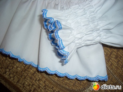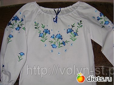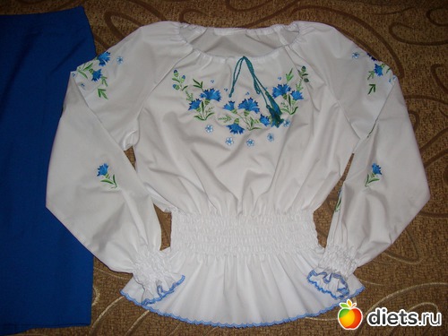 Это фото с сайта компании, где я ее купила, тут не видно ее полностью, но скажу, что низ был подшит обычно с подгибом, низ рукавов был на резинке. Но мне такой широкий крой не идет - у меня широкие плечи и узкие бедра, поэтому решила вышиванку приталить, к тому же обработать двойной иглой низ вышиванки и рукавов в виде фестонов. Вот, смотрите, как получилось: