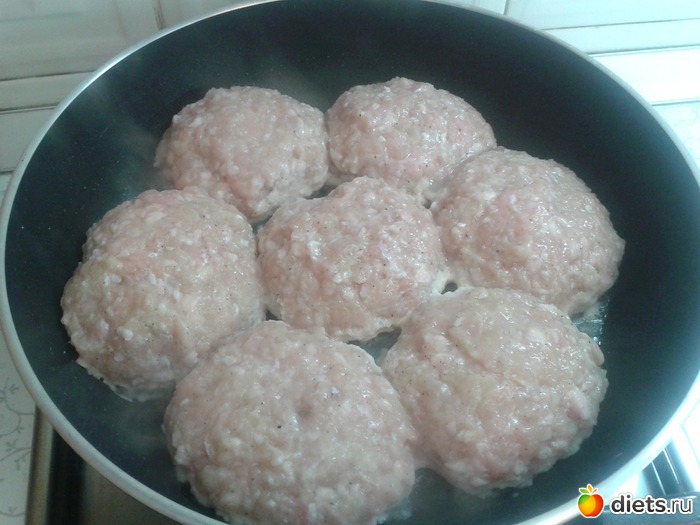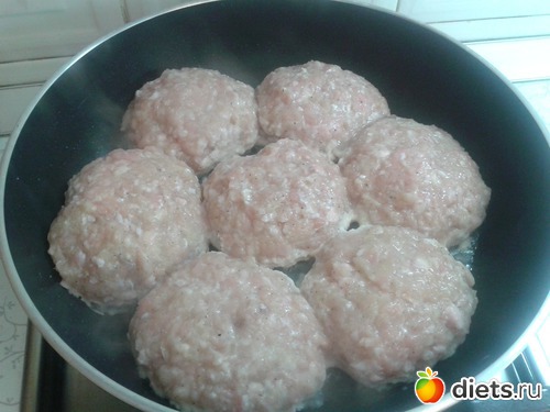 кисточкой распределяю каплю масла по сковороде ( в процессе жарки котлеты выделяю собственный сок и если готовить все на умеренном огне, то получается скорее не жарка, а томление или тушение.)