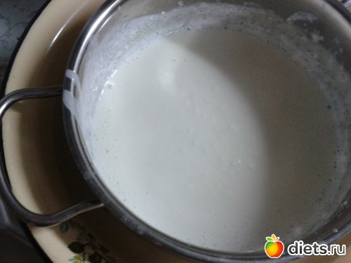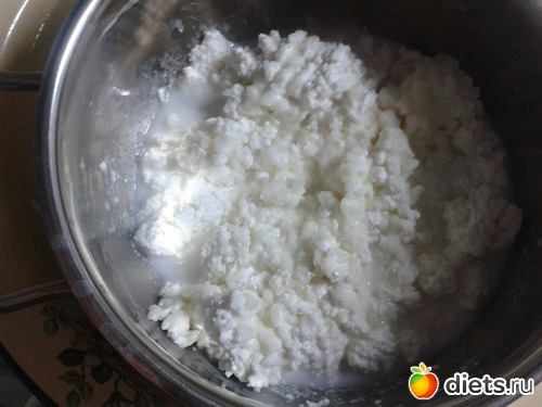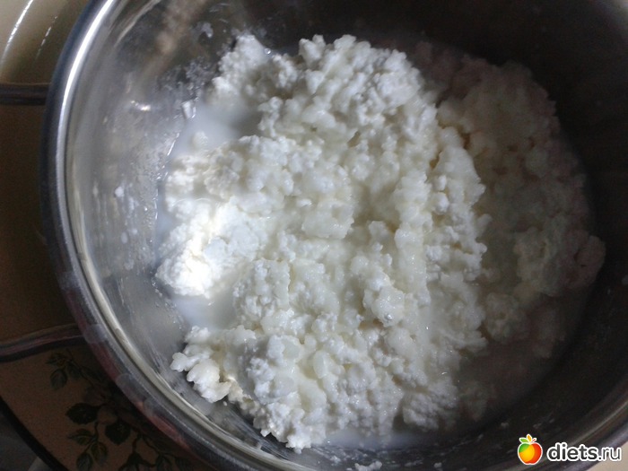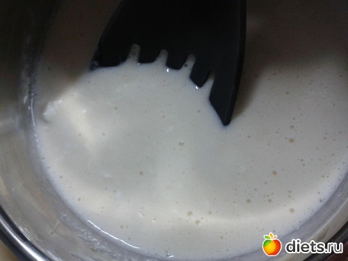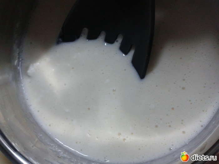 Начинается процесс плавления творога, нужно постоянно помешивать, чтоб растереть все крупинки ( можно использовать блендер). Спустя минут 5-10 творог приобретает жидкую и однородную консистенцию.