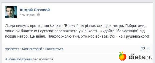 «Киевляне! У кого есть пневмат (хоть пистолеты, хоть винтовки), подносите на Грушевского. Устроим тир. Будем отвечать симметрично. Если у кого-то есть винтовки с нач. скоростью свыше 300 м в сек. - это будет люкс. Но даже старенькие ИЖ со скоростью 105 м в секунду тоже не будут лишними. Винтовку можно приносить разобранной. Можете пожертвовать - пожертвуйте. Не можете - устраивайте спортивные соревнования сами».